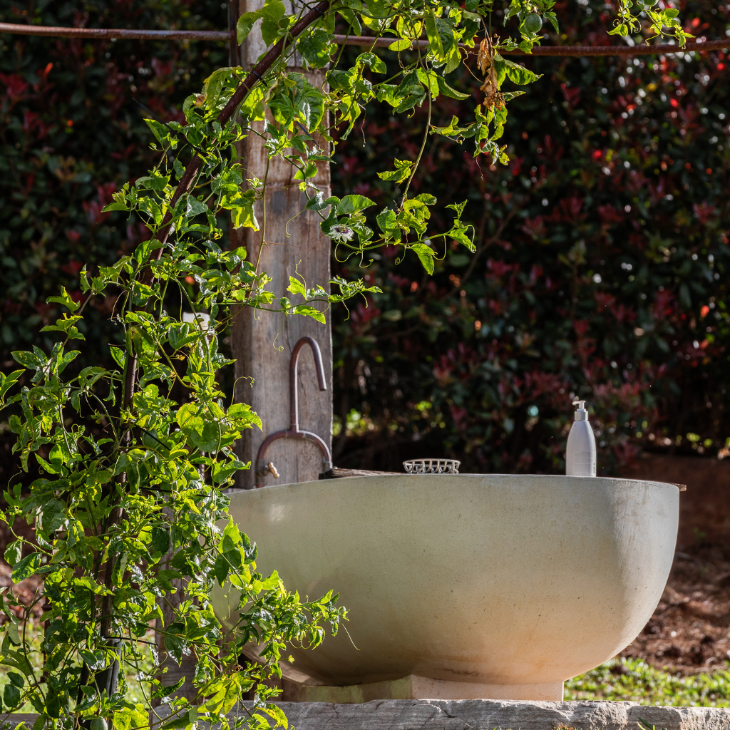 The main bedroom is light filled with a high raked ceiling. Tall bi-fold doors open the room out onto the expansive vistas of the property. The en-suite bathroom has a freestanding terrazzo bath from Bali with matching vanity basins, and internal shower and an outdoor courtyard and shower.