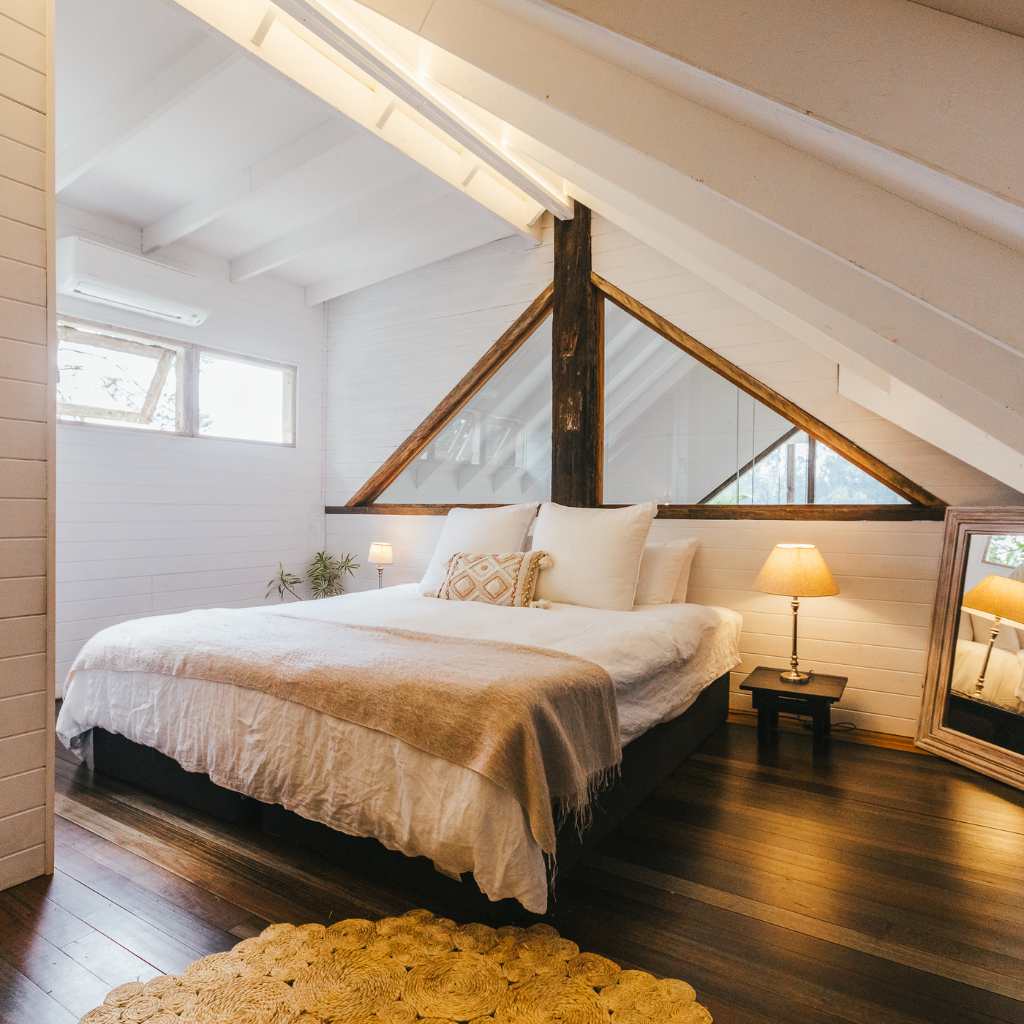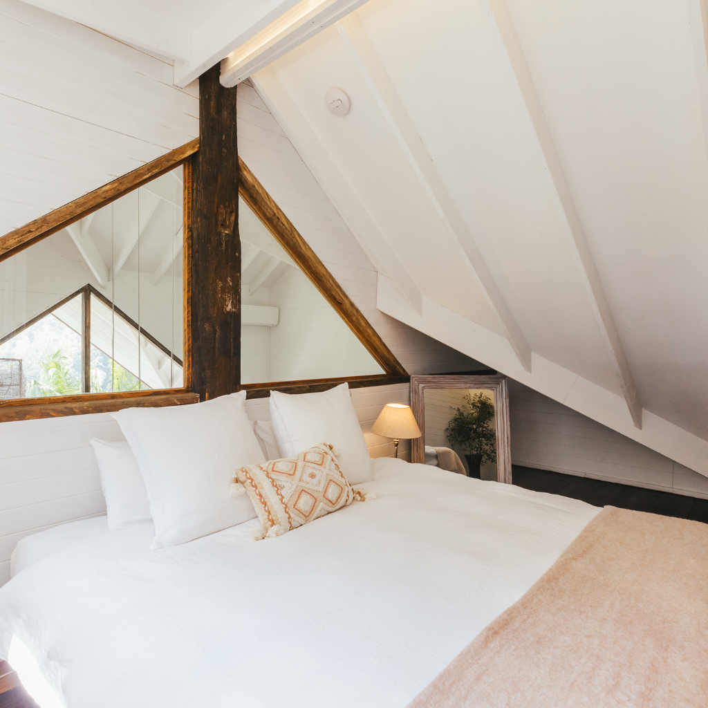 The Loft has the air of a country church, with its high-pitched ceilings and reclaimed timber walls. Perched on a quiet and private corner of the Sanctuary, the Loft has elevated views over the alpaca paddock and gorgeous sunsets to the west.