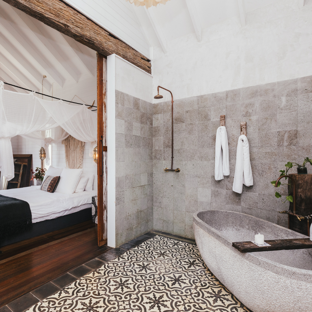 An exquisite upstairs room featuring a grand King-sized four-poster bed, a private balcony and soaring ceilings that create an expansive, airy ambiance. The ensuite bathroom is a true sanctuary, offering both indoor and outdoor showers, along with a spa bath that provides the ultimate relaxation experience. Every detail of the room is designed to offer a heavenly escape.