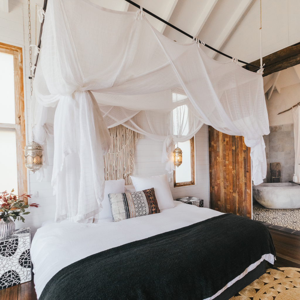 The master ensuite bedroom upstairs with its pitched ceiling and exposed trusses has a King four-poster bed hand crafted out of recycled timber, and a terrazzo spa-bath.